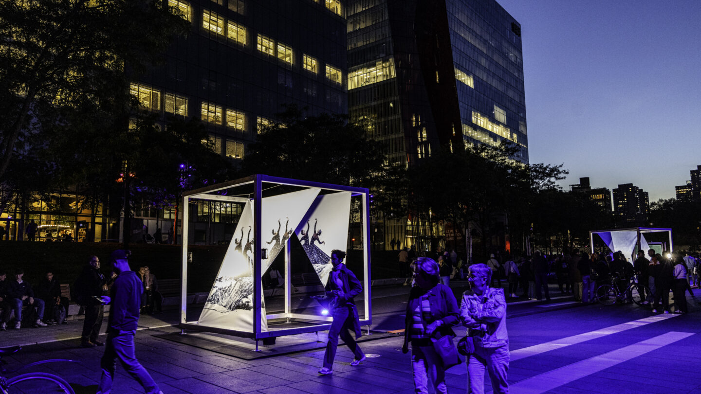 Portée par la danse, L’Effet Marée Noire est une installation d’arts médiatiques à ciel ouvert unissant photographies et projections, inspirée du court métrage éponyme. Dès la tombée du jour, trois imposantes structures artistiques cubiques s'illuminent pour offrir aux passants des fragments poétiques et percutants. L'installation d'art public éco-artistique met en lumière les sources d'inspiration de Chantal Caron et révèlent des images inédites du court métrage acclamé partout dans le monde.