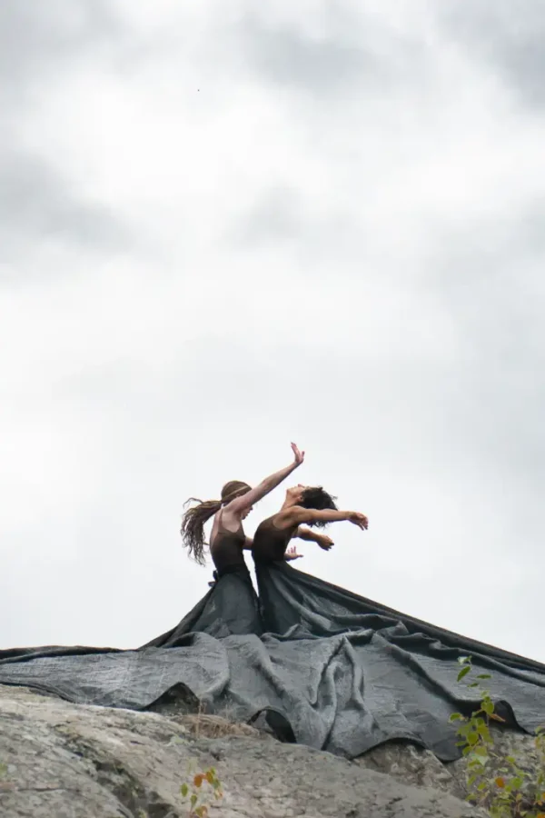 Dans une performance qui met en symbiose deux déesses marines captives de la Grande Marée noire, les mouvements ondulatoires, luttes et la contraction des corps agissent tels l’inspiration d’un souffle ou d’une vague.